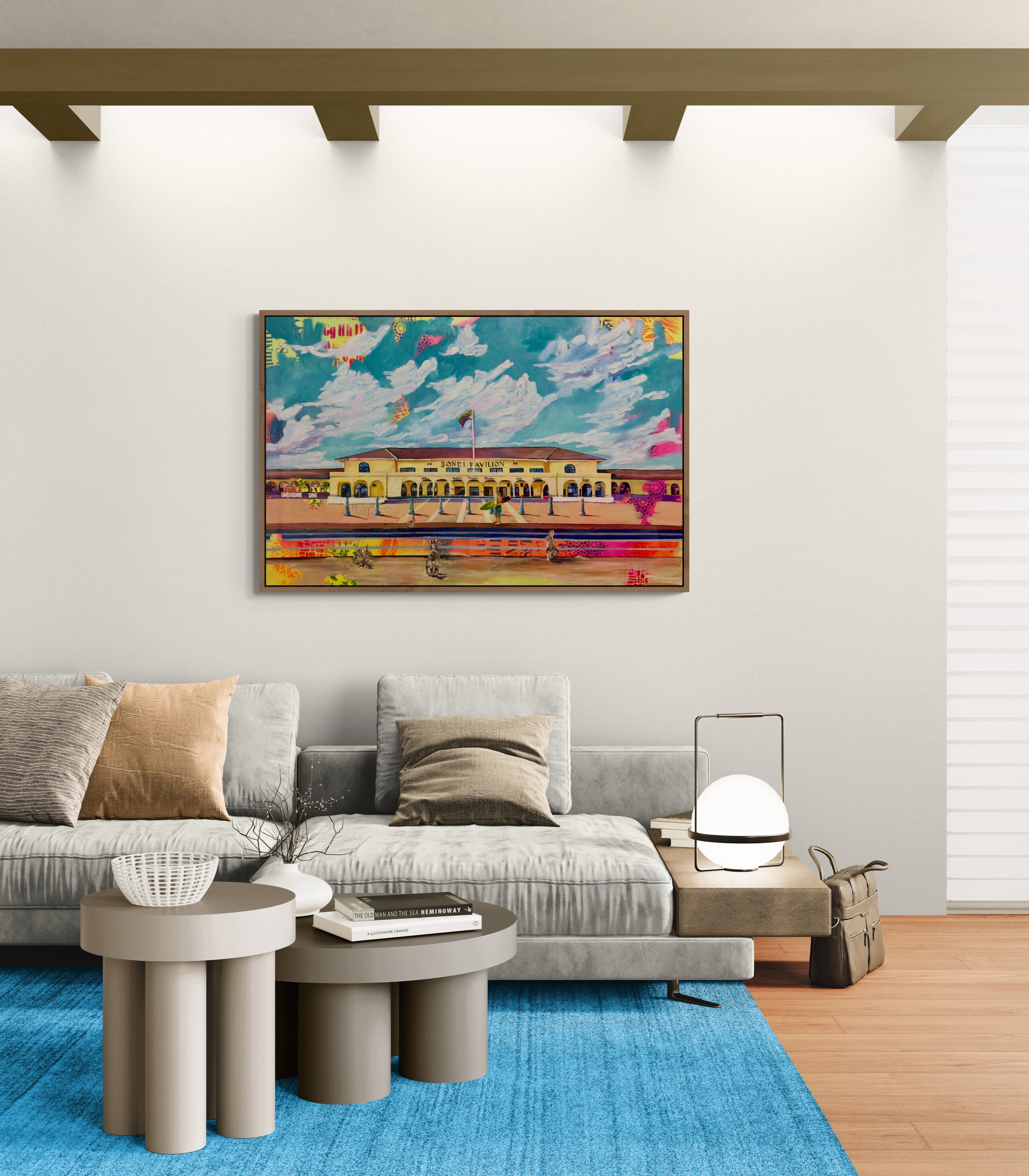Maggie’s vibrant palette brings this emotional duality to life. Neon pinks, electric blues, glowing oranges, and purples light up each canvas with energy, transforming feelings of displacement into something bold, joyful, and magnetic. The colours amplify both nostalgia and immediacy, allowing memory and the present moment to collide in striking, surreal compositions.