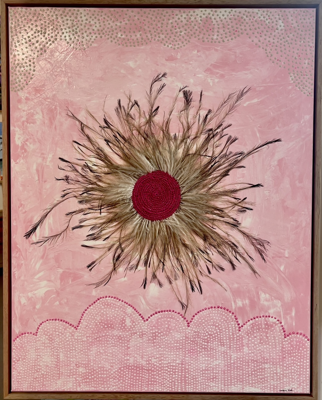 Richly textured and meticulously detailed, the works merge tactile, handwoven raffia forms with intricate painted surfaces and natural emu feathers. The circular woven motifs—central to much of Debbie’s practice—speak to cycles of life, the strength of community, and the interconnectedness of all living things. Radiating outward in organic patterns, the feathers bring movement and softness, echoing the rhythm of Country and the spirit of the emu—resilient, grounded, and strong.