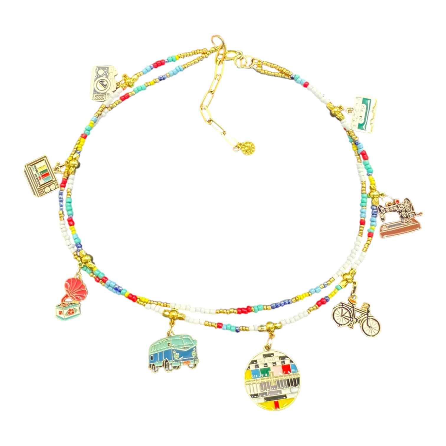 Each piece is handcrafted with semi-precious stones and glistening crystals, combining nostalgia with a modern pop-art flair. It’s the kind of necklace that tells stories — every charm a tiny time capsule of joy.