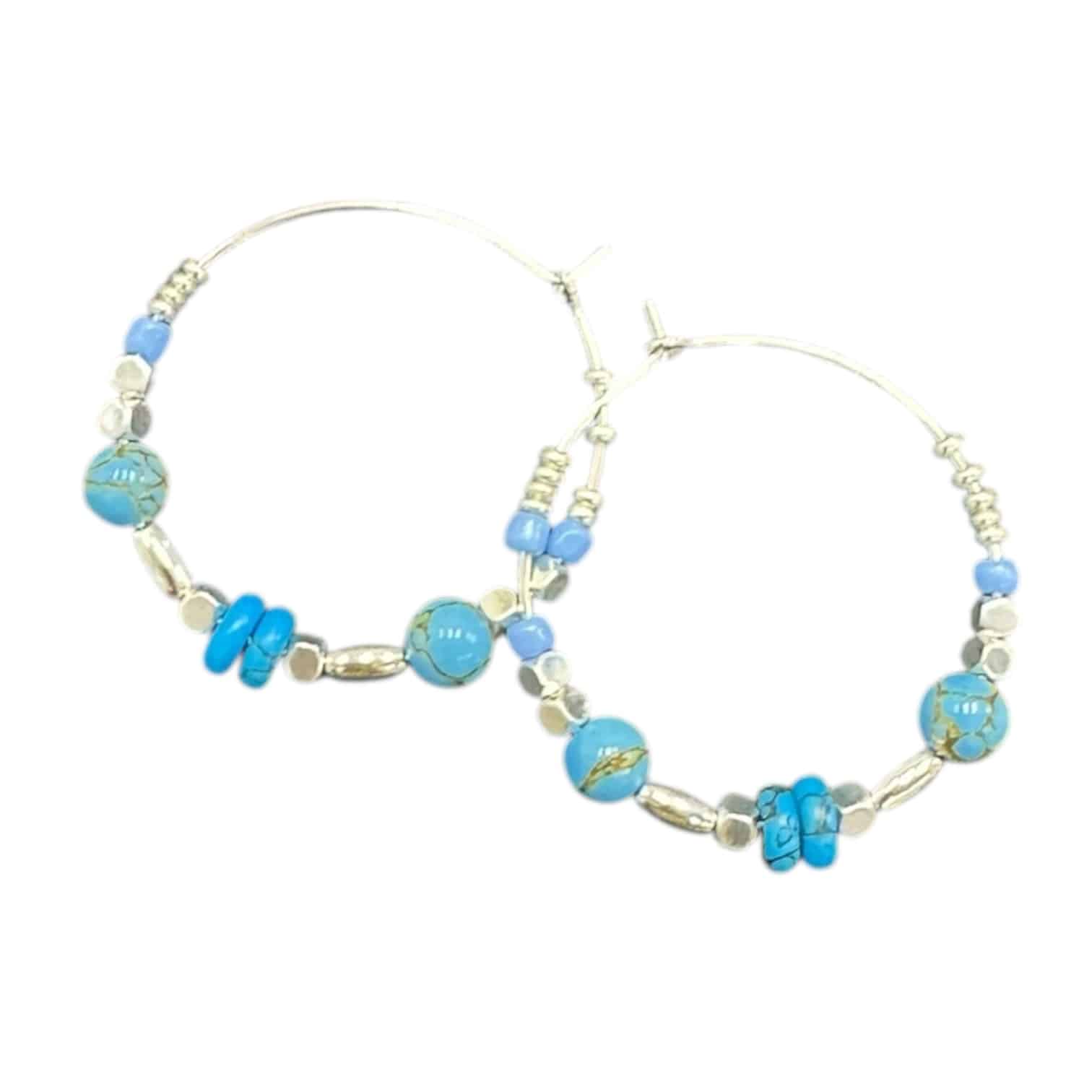 The Turquoise Dreamers earrings are pure wanderlust — breezy, sun-kissed, and brimming with coastal energy. Each handmade pair features turquoise-coloured stones flecked with soft veins of cream and gold, reminiscent of ocean foam against warm sand.