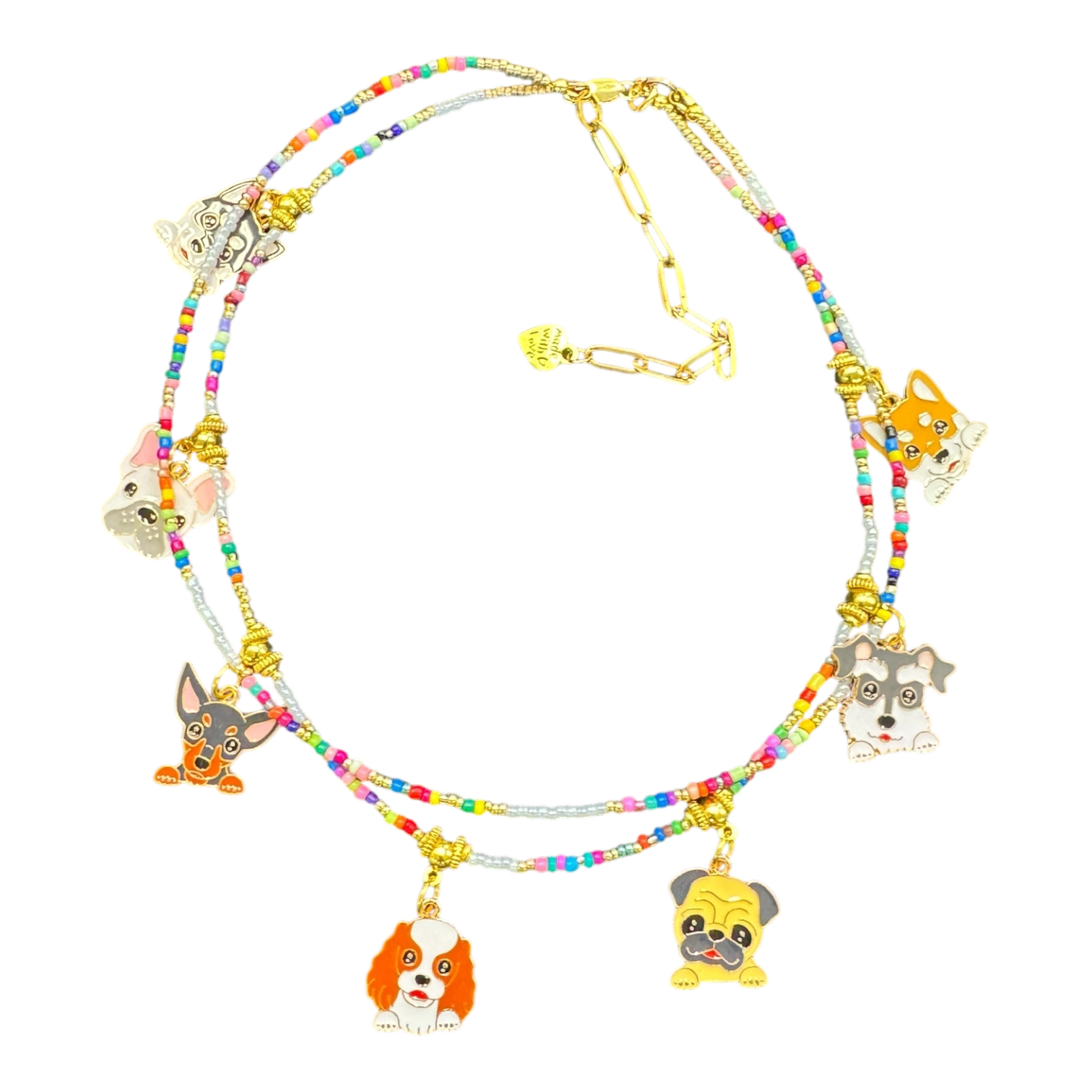 Cute doesn’t even begin to cover it — Puppy Parade is the ultimate necklace for dog lovers, fun-lovers, colour-lovers… basically anyone with a pulse. This double-strand handmade piece brings together rainbow beads, sparkling semi-precious stones, and the most adorable enamel dog charms you’ve ever seen. There’s a Frenchie with attitude, a sweet Cavalier, a cheeky Dachshund, a squishy little Pug, a Corgi who looks ready to zoom, a fluffy Aussie Shepherd, and more — each one bursting with colour and personality.