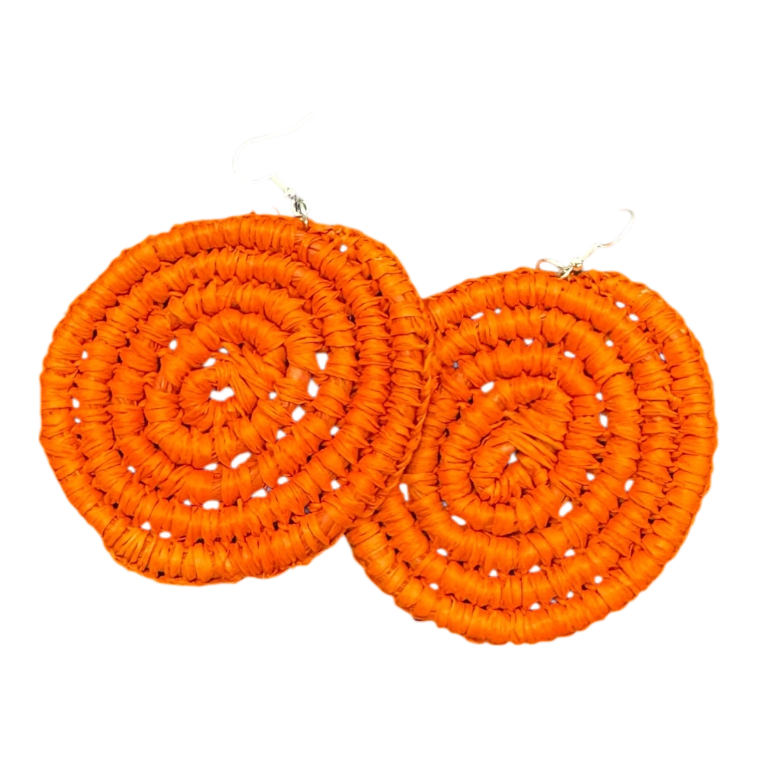 The raffia used here is dyed in the most electric orange — bold enough to turn heads, yet soft enough to wear with absolutely anything. The texture is organic and slightly rustic, adding depth and dimension to the circular form. Despite their statement size, they are incredibly lightweight, making them perfect for all-day wear without any discomfort.